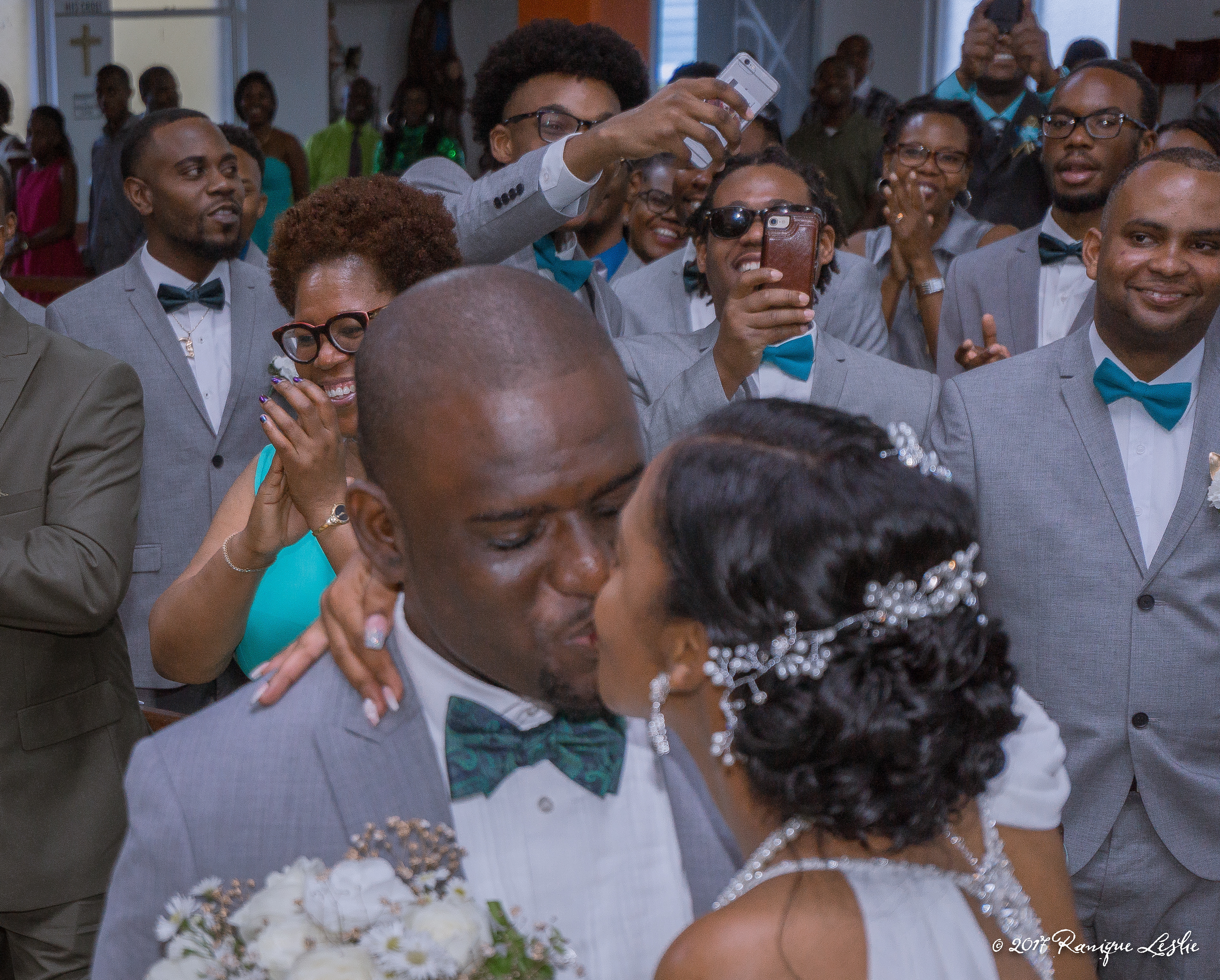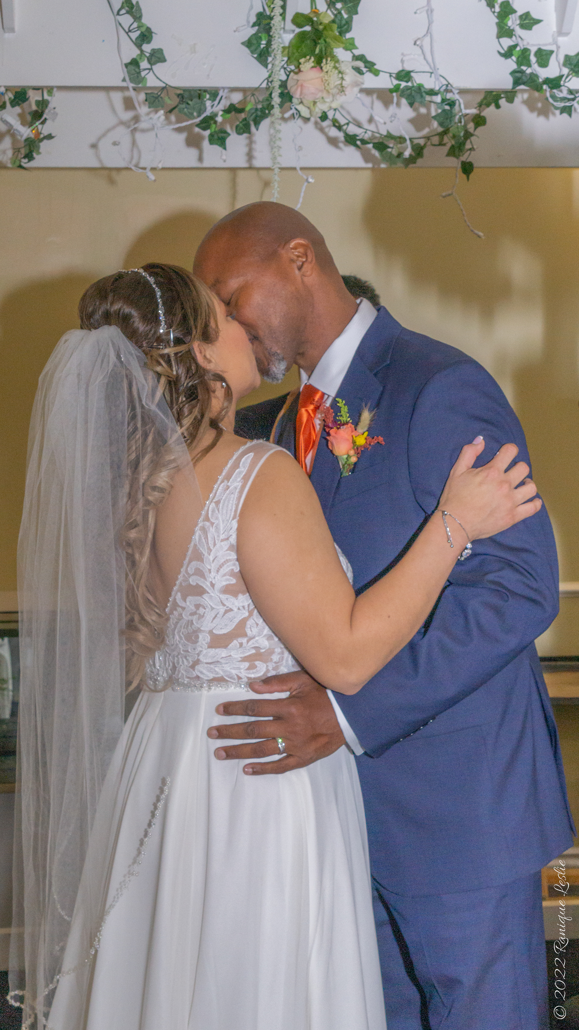 Bride and Groom kisses at altar. Church Ceremony in Waukegan, IL