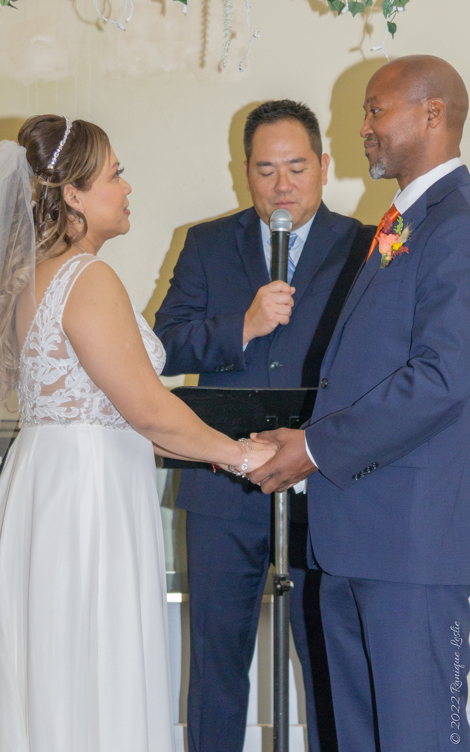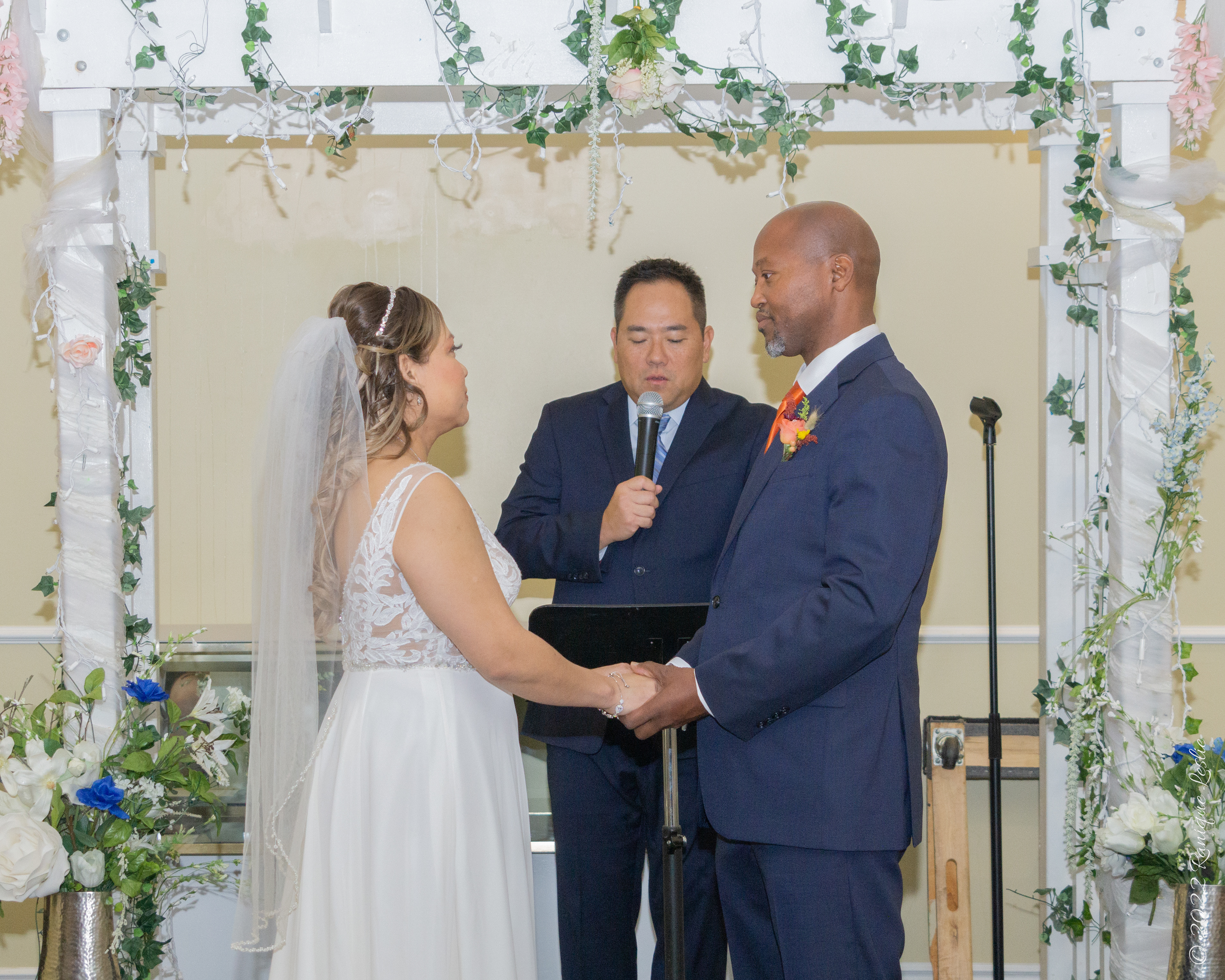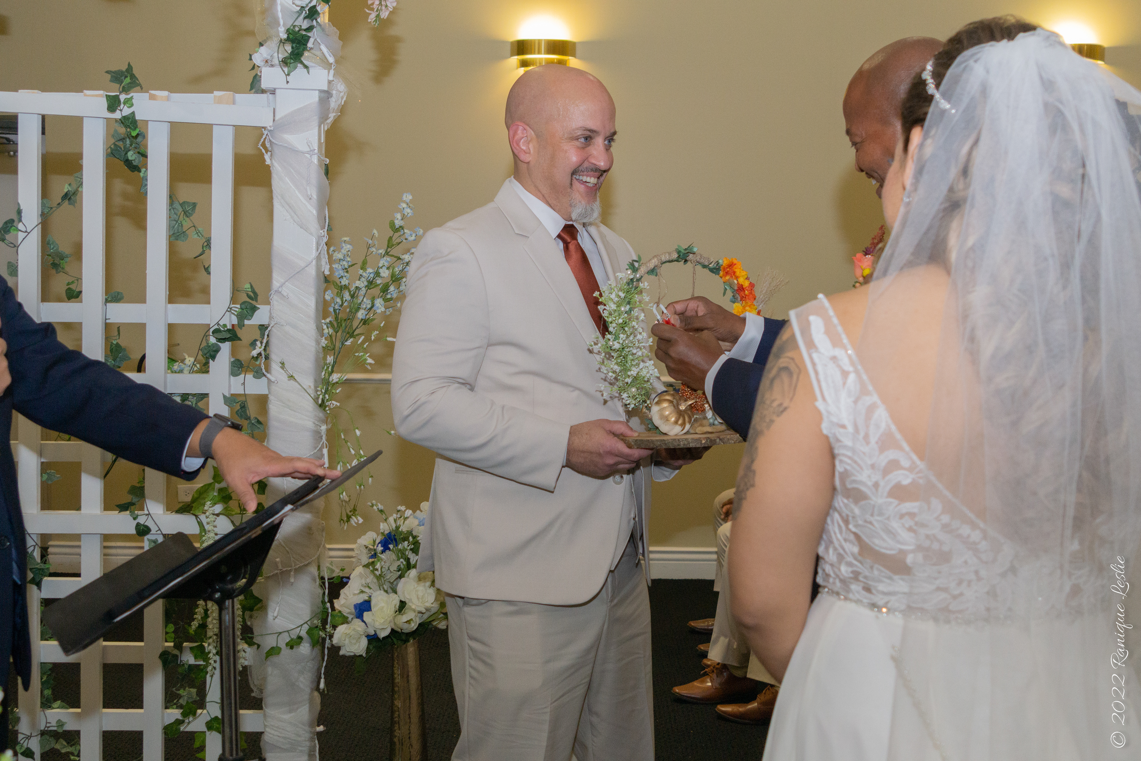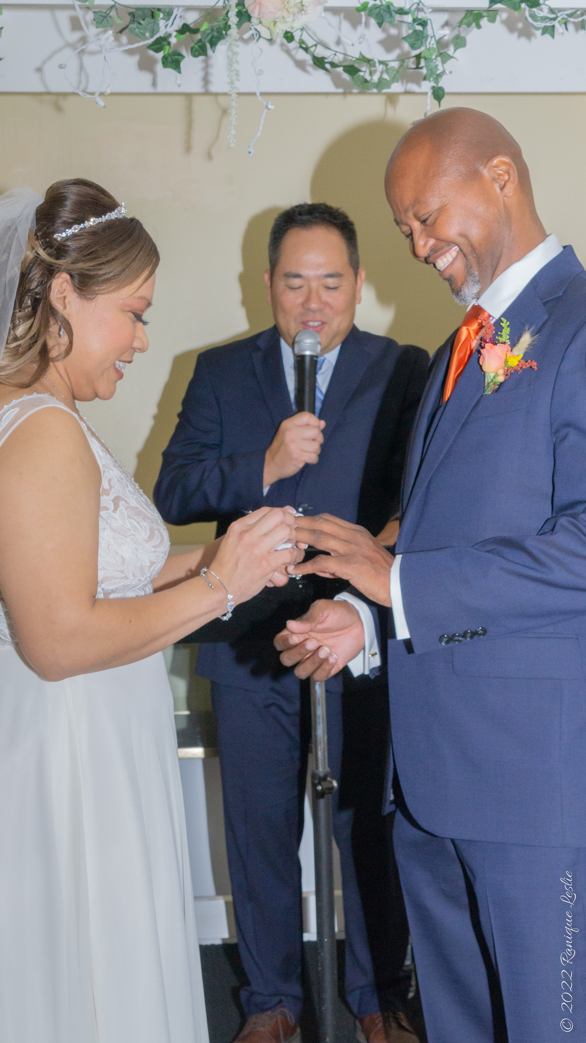 Bride placing ring on Groom's finger at Ceremony in Waukegan, IL